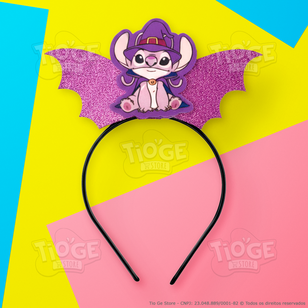 - 1 Arco Tiara Infantil Angel Stitch Bruxa com Asas de Morcego Rosa em EVA com Glitter.