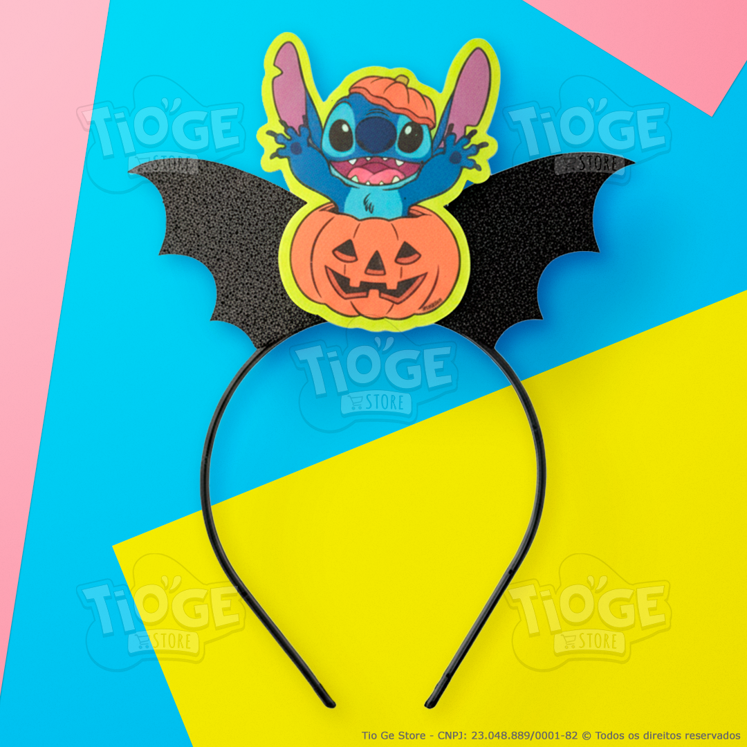 - 1 Arco Tiara Infantil Stitch Abóbora com Asas de Morcego Preto em EVA com Glitter.