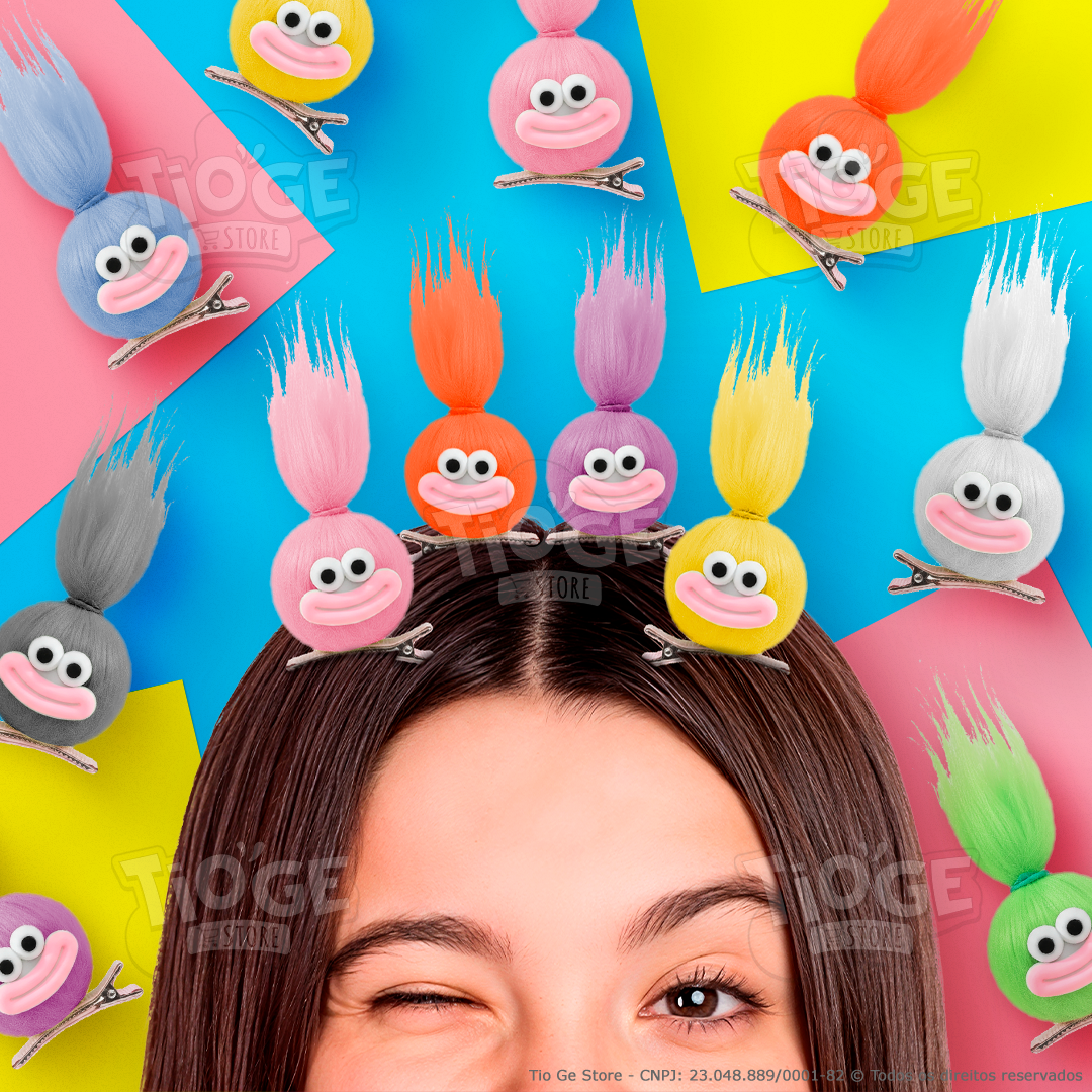 Deixe o cabelo das crianças ainda mais divertido com o Monstrinho Trolls Bolinha Cabeluda com Olhos e Boca Grandes, um acessório fofo, engraçado e super criativo para o Dia do Cabelo Maluco, festas escolares e fantasias. Cada monstrinho vem fixado em uma presilha tipo bico de pato, fácil de colocar e segura para manter firme no cabelo durante toda a brincadeira. O cabelo colorido e o rostinho divertido transformam qualquer penteado em uma atração especial.